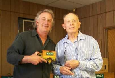 During the Sierra Valley Resource Conservation District (SVRCD) meeting on April 7th at the Portola City Chambers, Gary Romano receives an antique wooden farm truck inscribed Sierra Valley (Farms) from the new President of SVCRD, Gale Dupree. Gary Romano is the owner of Sierra Valley Farms.